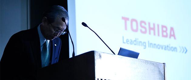 2015年7月21日,有一副圖片幾乎登上了各大國(guó)際媒體的頭條:三位西裝革履的男士在新聞發(fā)布會(huì)時(shí)一齊鞠躬。這三位舉止謙卑的男士是時(shí)任社長(zhǎng)田中久雄為代表的東芝管理層。