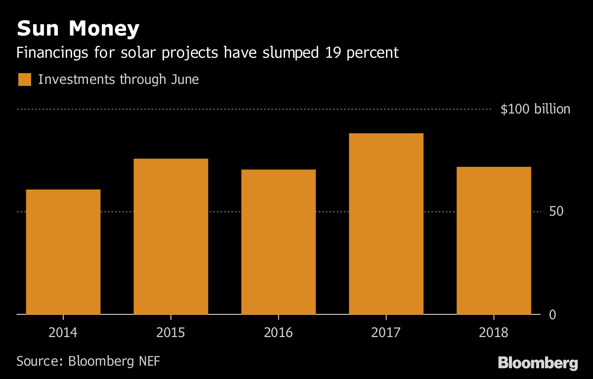 但中國并不是太陽能投資滯后的唯一原因。太陽能電池板的平均價格在去年下降了19%。這意味著太陽能發(fā)電場建設(shè)成本更低,因此需要的投資降低。