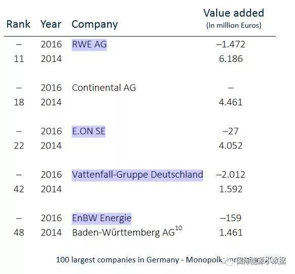 而僅僅2年之后,隨著德國能源轉(zhuǎn)型的進(jìn)程,這些公司業(yè)務(wù)重整、剝離,常規(guī)能源電廠被重新估值,德國Big Four集體退出了百強(qiáng)企業(yè),標(biāo)志著能源產(chǎn)業(yè)朝著低碳、多元、分散化的發(fā)展趨向。