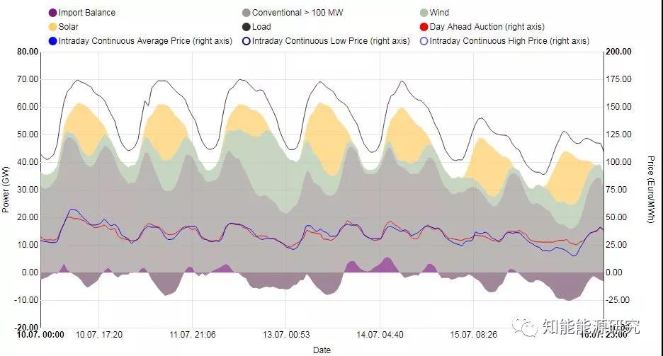 2、去年是德國(guó)可再生電力生產(chǎn)的好年頭,特別是風(fēng)電??偣伯a(chǎn)生了104 TWh的風(fēng)和38 TWh的太陽(yáng)能電力。德國(guó)的總發(fā)電量約為650 TWh,風(fēng)電和太陽(yáng)能的份額分別為16%和6%。然而,考慮到可變可再生能源的實(shí)際整合,有效市場(chǎng)份額下降約25%,因?yàn)榈聡?guó)嚴(yán)重依賴進(jìn)口/出口來平衡其風(fēng)/太陽(yáng)能產(chǎn)量。下圖2017年的樣本周表明風(fēng)/太陽(yáng)能輸出與電力出口之間明確相關(guān)。