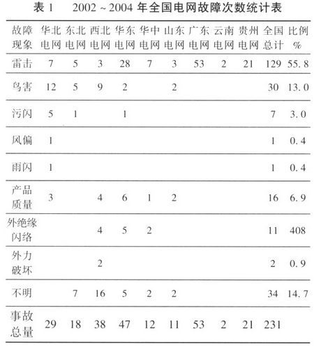 從表1所列2002~2004年全國(guó)電網(wǎng)故障次數(shù)統(tǒng)計(jì)知,華中電網(wǎng)因雷擊造成的事故約占其事故總數(shù)的58.3%。