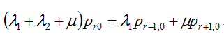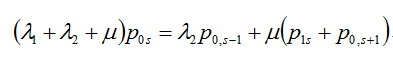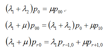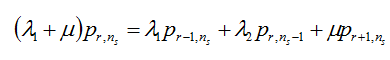 圖1中所體現(xiàn)出來的優(yōu)先制度為:當r>0時,(r,s+1)狀態(tài)不能轉移到(r,s)狀態(tài),因為一旦有線路空閑,A隊就會占用線路,就轉移到(r-1,s+1)狀態(tài)。由圖1可寫出穩(wěn)態(tài)下的系統(tǒng)狀態(tài)方程: