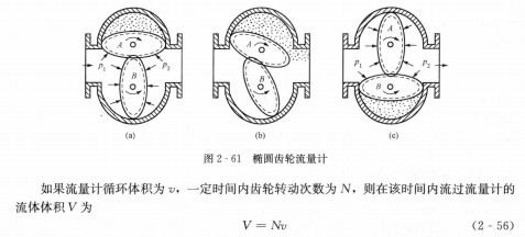 (1)橢圓齒輪流量計(jì)。橢圓齒輪流量計(jì)工作原理:兩個橢圓齒輪具有相互滾動并進(jìn)行接觸旋轉(zhuǎn)的特殊形狀,見圖2-61。圖中Pi和p2分別表示人口壓力和出口壓力,顯然p1>p2。在圖2-61(a)所示位置時,上方齒輪為主動輪,下方齒輪則為從動輪;當(dāng)旋轉(zhuǎn)到圖2-61(c)所示位置時,下方齒輪變?yōu)橹鲃虞?,上方齒輪則為從動輪,完成一個循環(huán)。一次循環(huán)動作排出四個由齒輪與殼壁間圍成的新月形空腔的流體體積,該體積稱作流量計(jì)的循環(huán)體積。