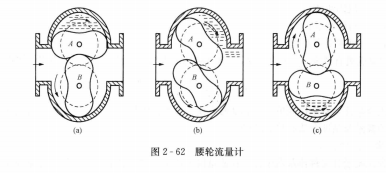 (2)腰輪流量計(jì)。腰輪流量計(jì)又稱羅茨流量計(jì),工作原理與橢圓齒輪流量計(jì)相同,特點(diǎn)是腰輪上沒有齒,它們不是直接相互嚙合轉(zhuǎn)動,而是通過安裝在殼體外的傳動齒輪組進(jìn)行傳動,即腰輪流量計(jì)的轉(zhuǎn)子是一對不帶齒的腰形輪,在轉(zhuǎn)動過程中依靠套在殼體外的與腰輪同軸上的嚙合齒輪來完成驅(qū)動,其結(jié)構(gòu)見圖2-62。腰輪流量計(jì)除可測量液體外,還可測量氣體,精度可達(dá)±0.1%,并可做標(biāo)準(zhǔn)表使用,最大流量可達(dá)1000m3/h。