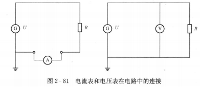 電流、電壓一般都采用直接測量方法,即采用直讀式模擬或數(shù)字的電流、電壓表測量。測電流時與被測電路串聯(lián),測電壓時與被測電路并聯(lián),但應(yīng)注意連接在電路中的位置,即電流表線圈應(yīng)接在低電位端,電壓表接地標(biāo)志應(yīng)接在低電位端,如圖2-81所示。