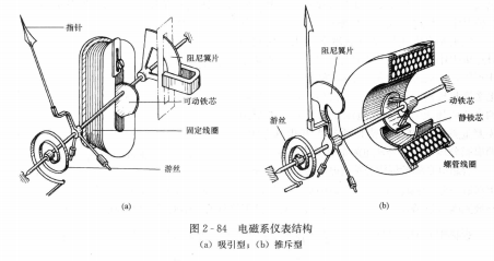 電磁系儀表結(jié)構(gòu)有吸引型、推斥型和吸引一推斥型三種形式(見圖2-84)。吸引型的驅(qū)動力矩是利用線圈通電后,對可動鐵芯產(chǎn)生吸引力.使指針偏轉(zhuǎn)。推斥型則靠線圈同時對固定、可動鐵芯進(jìn)行磁化,由于磁化的極性相同,產(chǎn)生互斥而形成驅(qū)動力矩。顯然驅(qū)動力矩與通過線圈的電流大小有關(guān),因此根據(jù)儀表指針偏轉(zhuǎn)角的大小即可得到電流值。但由于指針偏轉(zhuǎn)角與被測電流的平方成正比,因此標(biāo)尺呈平方律特性,前密后疏。另外,電磁系儀表的固定線圈有感抗,鐵片有渦流,這些都隨頻率而改變,使讀數(shù)產(chǎn)生誤差。所以電磁系儀表一般只適用于工頻測量。