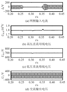 時,即減少功率輸出的情況下,MMC-SST并網(wǎng)電流相應增大,而同時在MMC-SST各級控制的調節(jié)下在光伏和風力發(fā)電系統(tǒng)輸出功率改變時,中壓直流母線電壓發(fā)生微弱波動但很快恢復正常,而交流輸出電壓始終保持穩(wěn)定。