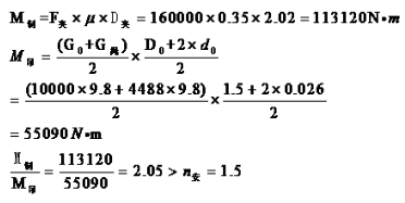 μ:摩擦系數(shù),取0.35;n安 :安全制動器安全系數(shù),取1.5;M制:安全制動器制動力矩;M吊:吊重產(chǎn)生的力矩;其它符號同上。
