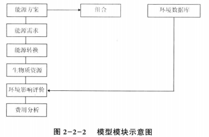 1)能源方案主體模塊及其功能:能源方案主體模塊由能源需求、能源轉(zhuǎn)換、生物資源、環(huán)境影響預(yù)測、費(fèi)用分析等五部分組成。