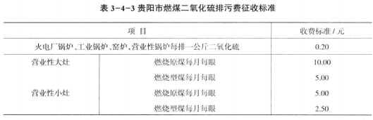 貴陽市1990年就開始對7個(gè)主要行業(yè),按國家“準(zhǔn)污染、誰治理”、“準(zhǔn)污染、誰負(fù)擔(dān)”的原則,對燃煤二氧化硫污染實(shí)行總量收費(fèi)政策,每公斤二氧化硫收費(fèi)為0.2元。1991年,貴陽市政府?dāng)M定了《貴陽市二氧化硫排污費(fèi)征收標(biāo)準(zhǔn)》,明確了收費(fèi)范圍、收費(fèi)辦法、收費(fèi)的管理和使用辦法等有關(guān)事宜。1993年7月開始對經(jīng)營性燃煤排放征收二氧化硫排污費(fèi)。貴陽市燃煤二氧化硫排污費(fèi)征收標(biāo)準(zhǔn)列于表3-4-3 。