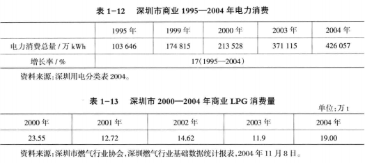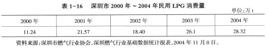 深圳市居民電力消費數(shù)據(jù)取自廣東省廣電集團有限公司深圳市《用電分類表》。1995年電力消費量為125 511萬kWh,到2004年增加到454 490萬kWh,1995-2004年年均增長率達到15%,見表1-15。2001年深圳市居民生活LPG消費量為11.24萬t,到2004年增加到28.32萬t,2001-2004年年均消費量為26%,見表1-16。