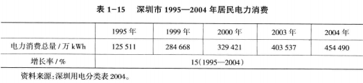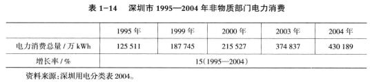 深圳市非物質(zhì)生產(chǎn)部門電力消費數(shù)據(jù)取自廣東省廣電集團有限公司深圳市《用電分類表》。1995年電力消費量為125 51 1萬kWh,到2004年增加到215 527萬kWh,1995-2004年年均增長率達到15%,見表1-14。
