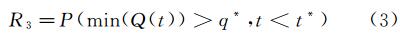 此指標(biāo)將魯棒性和迅速性分開衡量。通過設(shè)定系統(tǒng)功能在災(zāi)害中最低程度q*和最長(zhǎng)恢復(fù)時(shí)間t*的容許值,將系統(tǒng)韌性指標(biāo)定義為系統(tǒng)滿足設(shè)定值要求的概率[35],即