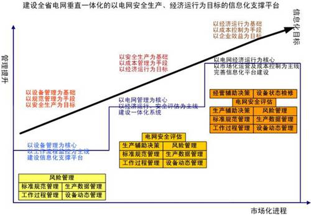 生產(chǎn)系統(tǒng)的目標(biāo)是采取“數(shù)據(jù)集中、應(yīng)用集中、分層維護(hù)”方式,建設(shè)以網(wǎng)絡(luò)技術(shù)為手段,以目標(biāo)體系為基礎(chǔ),以規(guī)章制度為依據(jù),以設(shè)備為核心,以落實崗位責(zé)任制為主線,以對日常工作的提醒、監(jiān)督、考核為推進(jìn)機(jī)制的垂直一體化的、分層面流程化管理的生產(chǎn)辦公管理信息系統(tǒng)。同時,在生產(chǎn)辦公系統(tǒng)的基礎(chǔ)上,建立輔助決策系統(tǒng),對設(shè)備基礎(chǔ)數(shù)據(jù)、標(biāo)準(zhǔn)數(shù)據(jù)、運(yùn)行數(shù)據(jù)、電網(wǎng)實時等數(shù)據(jù)結(jié)合歷史進(jìn)行分類整理;依據(jù)電力生產(chǎn)的管理邏輯,建立科學(xué)的量化的統(tǒng)計與預(yù)測分析模型,為電力生產(chǎn)的工作計劃、風(fēng)險控制、管理決策、電網(wǎng)規(guī)劃等提供科學(xué)的輔助決策分析手段與決策依據(jù)。 在具體實施上,系統(tǒng)開發(fā)和實施分三步走, 以提升管理水平為主線,最終實現(xiàn)實現(xiàn)生產(chǎn)系統(tǒng)為企業(yè)經(jīng)濟(jì)效益直接服務(wù)。(見附圖1)。