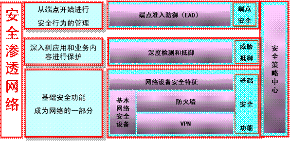 u       安全滲透網(wǎng)絡(luò)要求基礎(chǔ)安全特性成為網(wǎng)絡(luò)的一部分:也就是基礎(chǔ)安全特性應(yīng)該有機(jī)的滲透到網(wǎng)絡(luò)設(shè)備中,網(wǎng)絡(luò)可以彈性的調(diào)整和部署,以適應(yīng)因?yàn)闃I(yè)務(wù)變化引起的安全策略的變化。