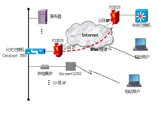 1、 在遼寧電力勘測設(shè)計院本部和紫薇仙莊分部的Internet出口處,部署PIX525 UR防火墻。PIX525之間通過VPN配置,建立IPSec隧道,組成遼寧電力勘測設(shè)計院的VPN系統(tǒng),實(shí)現(xiàn)院本部局域網(wǎng)系統(tǒng)與渾南紫薇仙莊之間互聯(lián)互通。同時在紫薇仙莊2樓網(wǎng)管中心機(jī)房部署分支交換機(jī)、服務(wù)器、ACS3.3認(rèn)證系統(tǒng)、UPS、AP的供電模塊,并通過超5類UTP雙絞線與報告廳及各會議室墻壁上安裝的AP無線接入點(diǎn)相連。