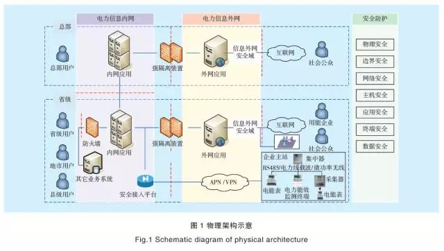 電能服務管理平臺物理架構(gòu)如圖1所示,旨在構(gòu)建兩級部署、多級應用的物理架構(gòu)及多系統(tǒng)集成的應用架構(gòu),基于內(nèi)外網(wǎng)混合應用模式、打造完善的安全防護體系,實現(xiàn)平臺內(nèi)外網(wǎng)統(tǒng)一應用。