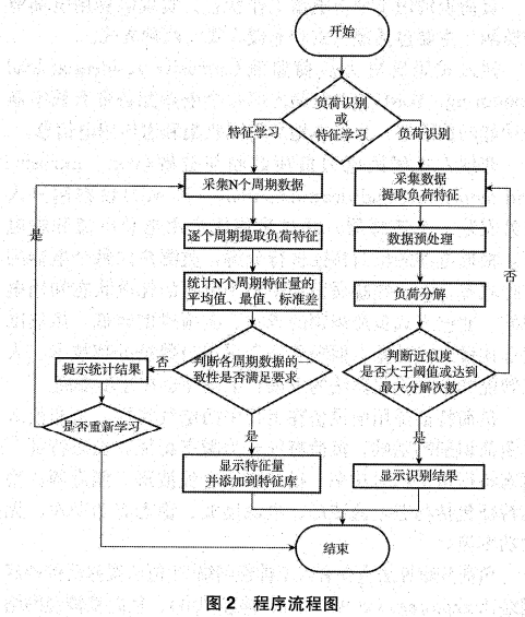 程序包括特征學(xué)習(xí)和負(fù)荷識(shí)別兩部分,流程圖如圖2所示。進(jìn)入程序后,用戶根據(jù)需要選擇工作模式,i如果采集新電器的負(fù)荷特征,選擇特征學(xué)習(xí);如果對(duì)已學(xué)習(xí)過(guò)電器進(jìn)行識(shí)別,選擇負(fù)荷識(shí)別。