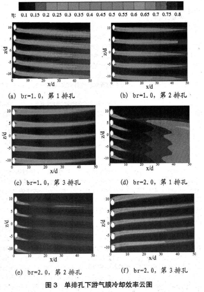吹風(fēng)比的大小代表了冷氣穿透主流邊界層進(jìn)入主流核心區(qū)的能力。圖3為單排孔在bf=1.0和br=2.0時(shí)的氣膜冷卻效率云圖。從圖中可以看出在同一吹風(fēng)比下,第1排孔展向擴(kuò)散特性最好?;鲃?dòng)方向,第1排扎在下游實(shí)現(xiàn)了氣膜全覆蓋,第2和第3排孔下游一直存在冷卻死區(qū)。隨著吹風(fēng)比的增大,冷氣在展向偏移更加明顯。