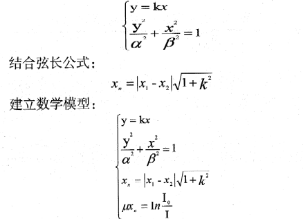 當(dāng)橢圓與標(biāo)準(zhǔn)圓在X光照方向上沒有發(fā)生疊加時,穿過標(biāo)準(zhǔn)圓形心的光線接收信息達(dá)到最大值。分析橢圓的特性日J(rèn)‘知,當(dāng)一組平行線照射橢圓時,穿過形心的宣線所截得的弦K最大,與形心距離等長的兩條平行線所截得的弦長長度相等。設(shè)通過坐標(biāo)原點(diǎn)(0,0)的直線與橢圓的兩個交點(diǎn)坐標(biāo)分別(x1、y2)、(x2、y2),可以建如下方程組: