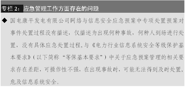 2. 部分電力企業(yè)對網(wǎng)絡(luò)與信息安全的應(yīng)急處置工作重視不足,應(yīng)急預(yù)案針對性、可操作性不足,應(yīng)急演練形式大于內(nèi)容,起不到發(fā)現(xiàn)問題、解決問題的作用。