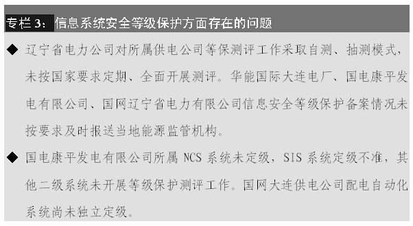 3. 部分電力企業(yè)對信息安全等級保護(hù)工作重視不夠,定級、備案、測評、整改等環(huán)節(jié)的各項要求落實不嚴(yán),主要體現(xiàn)在:
