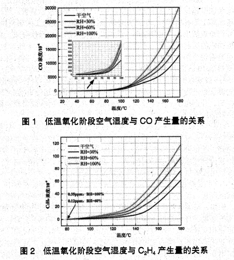 在空氣相對濕度為100%的條件下,環(huán)境溫度達(dá)到30℃就能產(chǎn)生CO;C2H4在80℃就會出現(xiàn)。在煤低溫氧化階段,礦井相對濕度越大,CO產(chǎn)生量越大;CO存在突變臨界溫度90℃,超過90℃后,CO產(chǎn)生量迅速增大。
