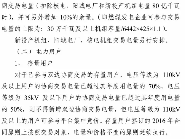 存量用戶簽訂的2016年合同原則上按照交易對(duì)象、電量和價(jià)格不變的原則延續(xù)執(zhí)行。