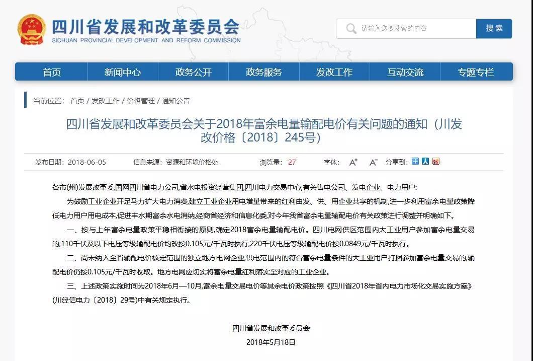 5月18日,四川省發(fā)改委發(fā)布《關(guān)于2018年富余電量輸配電價有關(guān)問題的通知》。文件明確規(guī)定, 2018年6月-10月四川電網(wǎng)范圍內(nèi),110千伏及以下電壓等級的大工業(yè)用戶,按0.105元/千瓦時的輸配電價參與富余電量交易;220千伏電壓等級的大工業(yè)用戶,按0.0849元/千瓦時的輸配電價參與富余電量交易。