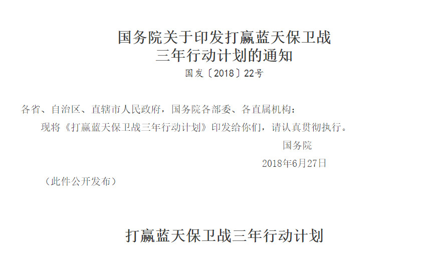 7月3日,國(guó)務(wù)院公布了打贏藍(lán)天保衛(wèi)戰(zhàn)三年行動(dòng)計(jì)劃的文件,這是為了確保空氣質(zhì)量進(jìn)行的環(huán)保治理與考核,這關(guān)乎14億人民的切身利益,治理的重