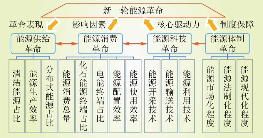 在全球面臨能源資源危機(jī)、氣候變化和環(huán)境污染等問題的背景下,世界各國(guó)開始探索以更加經(jīng)濟(jì)、高效、清潔的方式滿足經(jīng)濟(jì)社會(huì)發(fā)展需求的路徑,新舊能源系統(tǒng)逐步更迭過程催發(fā)了新一輪能源革命。這一過程將以優(yōu)化能源結(jié)構(gòu)、提高能源效率、促進(jìn)節(jié)能降耗、共享社會(huì)資源、實(shí)現(xiàn)可持續(xù)發(fā)展為目標(biāo),涵蓋能源開發(fā)、生產(chǎn)、加工、轉(zhuǎn)換、配置、消費(fèi)和管理等各個(gè)環(huán)節(jié),涉及經(jīng)濟(jì)、社會(huì)、政治、文化、生態(tài)諸多方面,如圖1所示。清潔低碳是新一輪能源革命的主要方向,再電氣化是新一輪能源革命的重要特點(diǎn),電能將在推動(dòng)人類能源利用從以化石能源為主向以清潔能源為主的戰(zhàn)略轉(zhuǎn)型中發(fā)揮核心作用[14]。