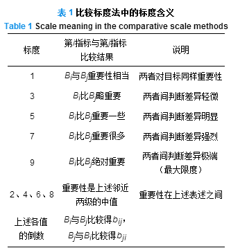 首先,為了保證權(quán)重計(jì)算的客觀準(zhǔn)確,在確定權(quán)重時(shí)需要對(duì)各要素的重要性進(jìn)行評(píng)判,運(yùn)用1-9的比例標(biāo)度法作為依據(jù)給出分值,如表1所示。