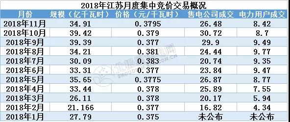 由于江蘇省月度集中競價交易不設交易電量上限,所以條件相對寬松,從2018年整體交易形勢來看,月度競價保持在相對穩(wěn)定程度。今年1-11月,江蘇的月度集中競價共成交355.486億千瓦時,成交價格在0.37-0.38元/千瓦時之間波動,平均成交價格為0.378元/千瓦時。值得注意的是2017年7月,江蘇省把上網(wǎng)電價0.378元/千瓦時上調(diào)至0.391元/千瓦時,升幅0.013元/千瓦時。然而,隨后月競價差似乎也沒多大波動,市場價格似乎也難以得到突破。這也使得江蘇的月競較其他省份來說,少了價差方面的大起大落,報價反而更加趨于理性。