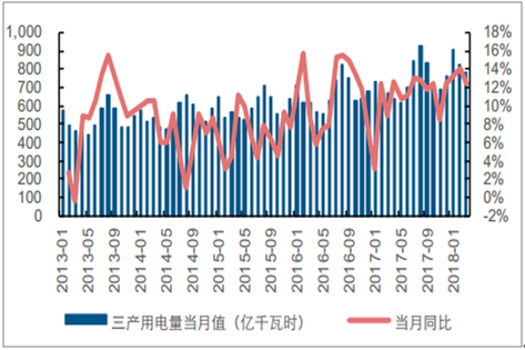 2018年1-3月三產(chǎn)累計(jì)用電量同比增長16.7%