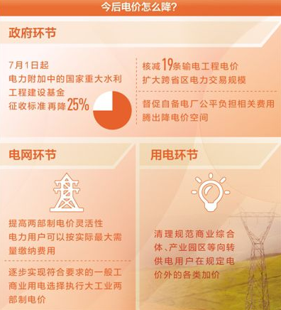第一項措施是從今年7月1日起,電力附加中的國家重大水利工程建設基金征收標準,在去年已經(jīng)降低25%的基礎上,再統(tǒng)一降低25%。
