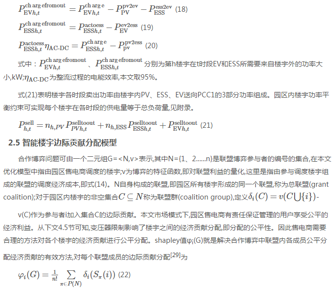 本文結(jié)合目前電力市場改革中可能出現(xiàn)的配售分離情形,提出了售電商在高比例分布式能源園區(qū)運營中可能承擔(dān)的新角色與新功能?;诖?針對含高比例分布式能源配置的智能樓宇組建的園區(qū)具有電能雙向流動性,各層次主體目標(biāo)多樣且相互制約以及配電變壓器功率越限問題,考慮交直流混合供電方式樓宇模型的功率流動并進行了細(xì)化,提出了售電商協(xié)調(diào)下的園區(qū)日前優(yōu)化調(diào)度模型。該模型在滿足EV用戶用電需求及用電費用最少的基礎(chǔ)上,同時滿足溫控負(fù)荷用戶的用電需求,實現(xiàn)園區(qū)內(nèi)電能共享,延長配電變壓器壽命,樓宇調(diào)度成本最低。通過算例分析,驗證了模型的可行性。并針對變壓器功率限制對園區(qū)各個樓宇的經(jīng)濟影響,基于合作博弈理論,提出采用shapley值合理分配各個樓宇的調(diào)度成本。