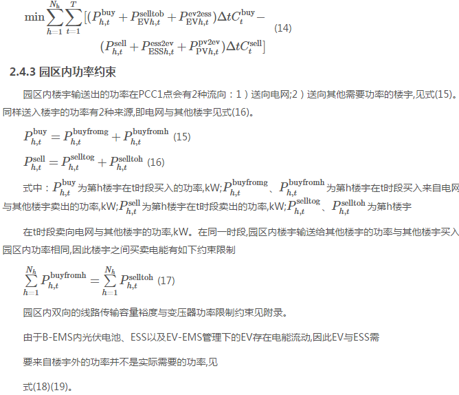 需求側(cè)響應(yīng)(demand response,DR)作為一種通過引導(dǎo)用戶主動參與電力市場使其用電行為發(fā)生改變的有效手段,在智能電網(wǎng)發(fā)展的大背景下實現(xiàn)源、網(wǎng)、荷、儲之間的互動具有重要地位[11-12]。有關(guān)研究指出目前的居民用電量比重越來越大、用電行為難以把握[13],因此需求側(cè)響應(yīng)的開展不再拘泥于工業(yè)園區(qū),家庭能源管理[13-14]與智能樓宇建設(shè)[15]的研究相繼成為我國需求側(cè)發(fā)展的熱點。目前針對居民智能小區(qū)的研究如下。文獻[16]研究了動態(tài)電價引導(dǎo)空調(diào)系統(tǒng)使用戶用電費用最少的優(yōu)化調(diào)度方法;文獻[17]在用戶的舒適度和負(fù)荷調(diào)整空間基礎(chǔ)上建立了直接負(fù)荷控制(direct load control,DLC)的空調(diào)負(fù)荷雙層優(yōu)化調(diào)度和控制模型;文獻[18-20]都是基于分時電價(time of use,TOU),在滿足EV用戶用電需求的同時有效地減少充電費用,最終實現(xiàn)削峰填谷、降低負(fù)荷方差;文獻[21]協(xié)調(diào)基于TOU與DLC的主動需求響應(yīng),綜合考慮EV用戶充電需求和配網(wǎng)負(fù)荷水平進行研究;文獻[7]把含有光伏的樓宇與電網(wǎng)側(cè)視為多個決策者進行非合作博弈,提出了一種基于光伏電能供需比的內(nèi)部價格模型,實現(xiàn)各經(jīng)濟主體有序電能交易。但文獻[7,16-21]沒有考慮用電設(shè)備之間的相互配合影響。文獻[22]將PV、EV、ESS協(xié)調(diào)控制,實現(xiàn)家庭能源管理用電費用最低;文獻[23]考慮了PV,可控負(fù)荷與EV充放電的聯(lián)合調(diào)度,實現(xiàn)了PV消納與經(jīng)濟最優(yōu)調(diào)度;文獻[24]考慮ESS、溫控負(fù)荷、EV,基于用戶側(cè)用電行為聚類分析,采用行為矯正的混合粒子群優(yōu)化算法實現(xiàn)需求響應(yīng)模型的互動化方法求解。但文