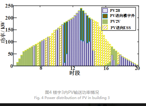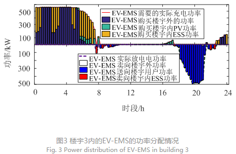 圖3是樓宇3內(nèi)EV-EMS管理的EV充放電以及功率分配情況??梢钥闯鰹榱吮WC用戶的用電需求,同時接受電價響應(yīng),大部分EV都處于低谷時段充電、高峰時段放電。此外,EV放電功率、充電功率和實際EV-EMS向樓宇外輸送的功率與樓宇外向EV-EMS輸送的功率相差很多,這是由于樓宇內(nèi)B-EMS在響應(yīng)電價引導(dǎo)后與EV-EMS之間進行了電能的相互流動,以樓宇3內(nèi)的光伏出力功率去向為例,見附錄圖4??梢钥闯鯬V的功率去向受