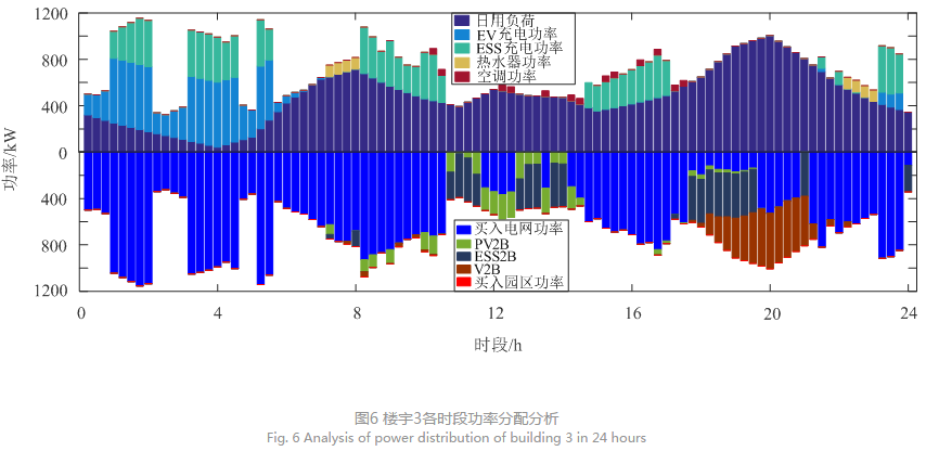 圖5為樓宇1的功率平衡情況??梢钥闯龊侠碚{(diào)度分布式能源,使樓宇購買電網(wǎng)功率發(fā)生了巨大改變。EV接受電價引導(dǎo)在低谷電價購買功率,在峰時進行V2B,把多余電能送向樓宇外;熱水器在文中屬于連續(xù)型溫控負(fù)荷,因此受電價時段的影響;空調(diào)在文中屬于可中斷負(fù)荷,在滿足居民用戶舒適度的前提下,可以關(guān)閉空調(diào)開關(guān),在即將到達用戶舒適度臨界點的時候再次啟動空調(diào)開關(guān);PV屬于免費能源,因此在峰時盡量進行PV2B,減少購電量;由于樓宇1任意時段的ESS、EV、PV的最大放電功率并沒有滿足用戶電能需求,因此在經(jīng)過售電商調(diào)度后,在大約11時段和13時段前后可以購買園區(qū)內(nèi)其他樓宇賣出的功率。圖6為樓宇3內(nèi)的功率平衡情況。由于樓宇3的ESS與PV多于其他樓宇的配置,當(dāng)樓宇3有電能需求時,其他樓宇也需要電能,由附錄式(17)(18)可知樓宇3可以把更多的電能送向樓宇外,但沒有任何時段可以買來自其他樓宇的電能。說明電能的流向雖然與電價引導(dǎo)有關(guān),但是首先要考慮模型的合理性。舉個例子,即使在峰時電價時段,但是園區(qū)整體仍然需要電能,在售電商管理下樓宇3發(fā)出的功率只能與電網(wǎng)流入的電能一起流向需要電能的樓宇。要強調(diào)的是為實現(xiàn)樓宇調(diào)度成本最低,電能相互流動,空調(diào)在滿足居民需求的同時,不同樓宇的開啟時段也發(fā)生了改變,發(fā)生在約17:00。另一個要強調(diào)的是ESS作為不同于EV的儲能設(shè)施,由售電商直接調(diào)度,由于變壓器功率限制以及優(yōu)先考慮EV充放電,在綜合考慮園區(qū)內(nèi)所有樓宇的ESS充放電計劃后、ESS沒有完全響應(yīng)電價。