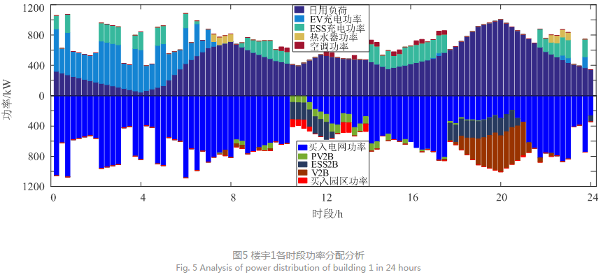 圖4為樓宇3的電能交易情況。在大約11:00和13:00—14:00期間,樓宇3向外進行售電,樓宇內(nèi)部也沒有進行電能共享,這是因為中午時段居民小區(qū)沒有并網(wǎng)的EV、用電負(fù)荷不高,同時也是PV出力最大的時段。在大約21:00時段也出現(xiàn)了少量電能售向樓宇外,這是由于這個時段大部分EV都已經(jīng)并網(wǎng),受電價影響進行放電,EV-EMS不僅滿足了樓宇內(nèi)的用戶用電需求,同時把多余的電能進行向其他樓宇或者電網(wǎng)輸送。B-EMS與EV-EMS電能之間相互流動,受線路因素影響,不可同時進行。在電價引導(dǎo)作用下,在高峰時段,居民負(fù)荷處于用電高峰,因此B-EMS不僅要從園區(qū)買入功率,也可以購買EV-EMS的電能;而在低谷電價時段,EV-EMS為滿足EV用戶享受最低電價對電能有大量需求,不僅要從園區(qū)和電網(wǎng)側(cè)購電,還要在滿足住宅區(qū)用戶用電需求的同時,購買一部分B-EMS的輸送功率。
