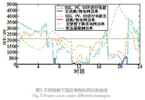 在不同策略下園區(qū)內(nèi)所有樓宇從電網(wǎng)側(cè)購、售功率情況對比見附錄圖5。無管理模式是指樓宇內(nèi)未安裝ESS、PV,同時溫控負(fù)荷在居民需求時段持續(xù)用電,EV并網(wǎng)后以最大功率充電直到充滿停止。由附錄圖5可知,無管理模式下負(fù)荷功率對配電變壓器的安全運行造成嚴(yán)重影響。在不受變壓器限制功率情況下,從樓宇內(nèi)ESS、PV、EV之間是否進行電能互送對比,說明樓宇內(nèi)電能相互流動可以有效減少園區(qū)與電網(wǎng)側(cè)來往功率,即減少了遠距離輸送電能帶來的損失。