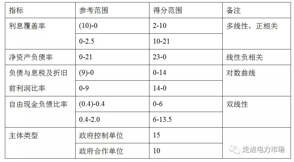 國際上電力市場的信用評價大都采用該種思路。以PJM為例,市場主體可以由評級機(jī)構(gòu)給出的信用評級得到信用評分,或由PJM根據(jù)其財(cái)務(wù)狀況、經(jīng)營情況、交易行為等進(jìn)行信用評分。在當(dāng)前的PJM信用評分體系中,涉及的評價指標(biāo)包括:利息覆蓋率,考察市場主體利潤與成本的關(guān)系;凈資產(chǎn)負(fù)債率和負(fù)債與利潤的比率,考慮市場主體資本結(jié)構(gòu),一般來說市場主體的負(fù)債太多會導(dǎo)致風(fēng)險過大,太少則盈利能力較差,適當(dāng)?shù)馁Y本結(jié)構(gòu)才是合理的;自由現(xiàn)金與負(fù)債比率,考察市場主體的短期債務(wù)償還能力。此外,還考察電力市場的市場主體是否與政府相關(guān),并根據(jù)密切程度給予不同的加分。這幾項(xiàng)之中,利息覆蓋率及凈資產(chǎn)負(fù)債率的評分的比重較大,負(fù)債與利潤比率、自由現(xiàn)金與負(fù)債比率以及主體類型的比重較小。然后將各項(xiàng)得分加起來得到市場主體的信用評分,見下表。