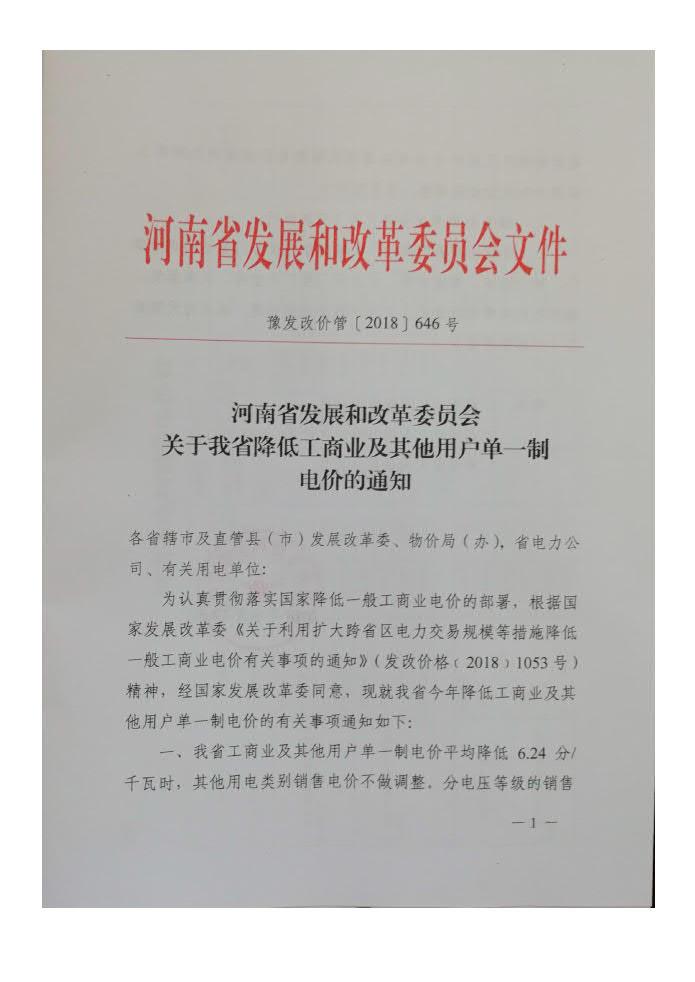 河南省發(fā)展和改革委員會(huì)關(guān)于我省降低工商業(yè)及其他用戶單一制電價(jià)的通知
