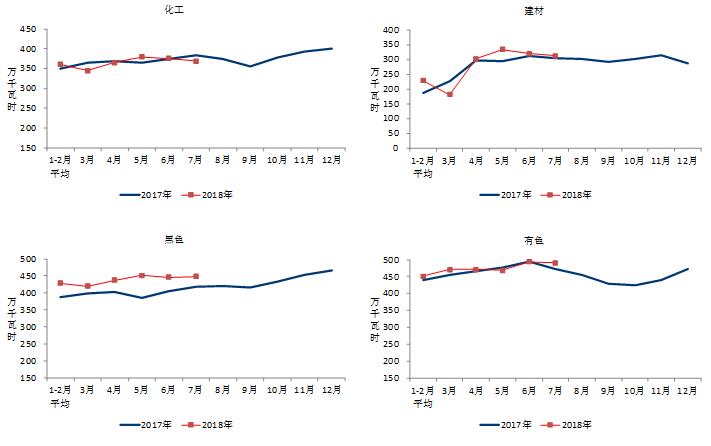 7月份,四大高載能行業(yè)用電量合計(jì)1620億千瓦時(shí),同比增長4.2%,占全社會用電量的比重為25.0%。其中,化工行業(yè)用電量369億千瓦時(shí),同比下降0.8%;建材行業(yè)用電量312億千瓦時(shí),同比增長2.4%;黑色金屬行業(yè)用電量448億千瓦時(shí),同比增長7.8%;有色金屬冶煉行業(yè)491億千瓦時(shí),同比增長6.1%。