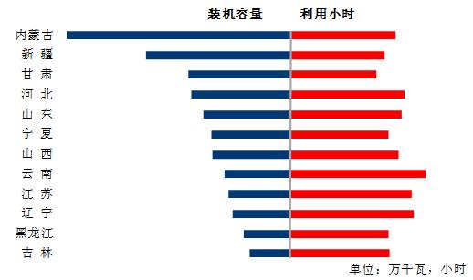 圖5 1-7月份風(fēng)電裝機(jī)較多省份風(fēng)電裝機(jī)容量和設(shè)備利用小時(shí)
