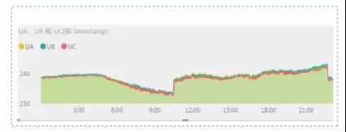除了改善用戶用電質量外,還可以為用戶帶來節(jié)能效益,根據(jù)不同用戶的不同情況,節(jié)能率可達到7%~15%。該用戶平均電壓為240V,DCVR設備將電壓穩(wěn)定于230V,圖中綠色陰影部分為該用戶可節(jié)約的電能,節(jié)能率為4.1%,如將該用戶電壓穩(wěn)定于設備標準額定電壓220V,節(jié)能率可達到8.5%。