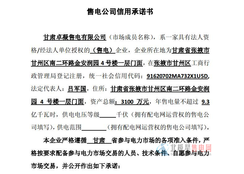 附件:甘肅卓凝售電有限公司售電公司公示信息