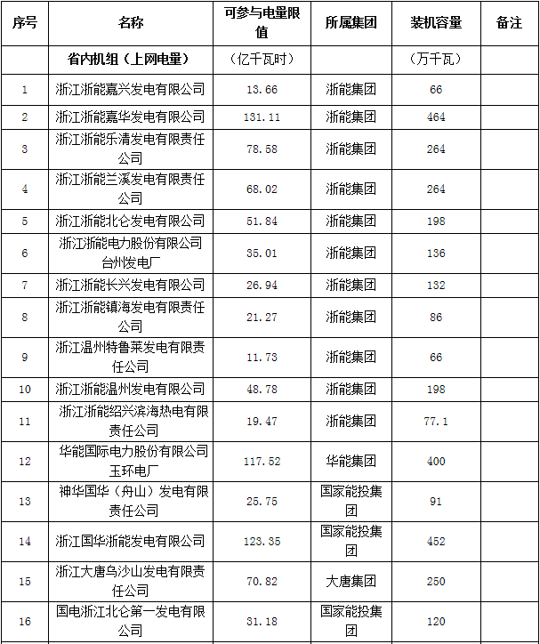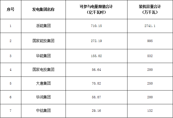 各發(fā)電集團(tuán)燃煤電廠參與本次試點(diǎn)電量限值及裝機(jī)容量