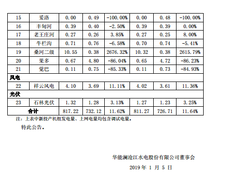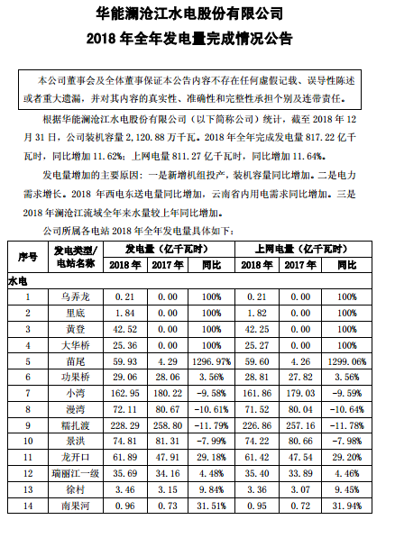 華能水電報(bào)表:2018年全年發(fā)電量同比增11.62%