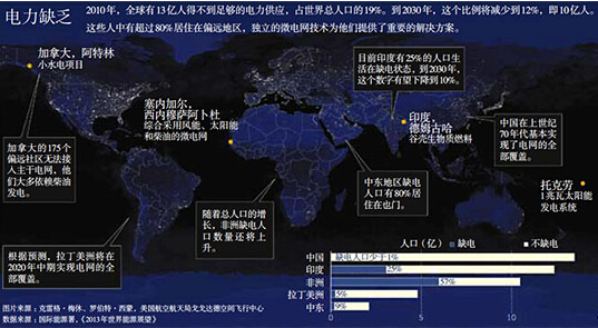在西半球電氣化程度最低的國家——海地,部分居民每月需要花費10美元購買蠟燭和煤油,用做家庭照明,這大概是美國普通家庭同類支出的125倍。許多印度居民需要支付額外費用,才能通過汽車電池為手機充電。在非洲,日光仍然是數(shù)百萬當?shù)鼐用竦闹饕彰鞣绞?。一些太平洋島嶼為滿足電力需求,不得不花費額外費用使用柴油發(fā)電機。目前,全球約有13億人無法獲得足夠的生活用電,雖然電網(wǎng)也在不斷擴展,但與很多人仍相距遙遠。